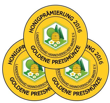 Auch 2016 haben wir wieder erfolgreich bei der Honigprämierung des Landesverbandes Hannoverscher Imker e.V. teilgenommen. Alle drei von uns eingeschickten Proben haben die goldene Preismünze mit voller Punktzahl erhalten. Die Honigprämierung ist immer wieder eine schöne Rückmeldung über die Qualität und Reinheit unseres Honigs.