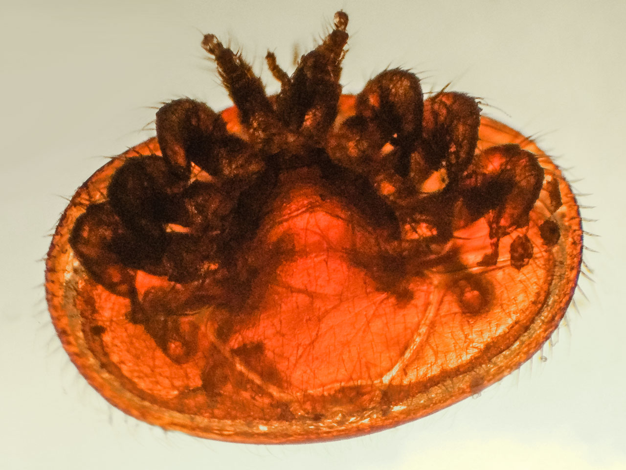 Bei unserem gestrigen Kontrollgang an den Bienenbeuten haben wir die Windeln entfernt und dabei einige Milben mit nach Hause genommen, um sie mit dem Mikroskop zu betrachten. Das oben abgebildete Foto ist dabei entstanden.